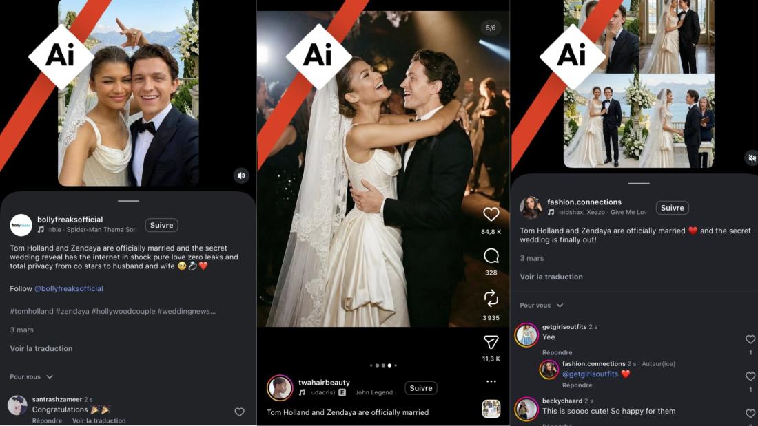 Une recherche d'images inversées, a permis à l'AFP de retrouver ces photos sur le compte X "AK" qui partage du contenu cinéma lié à l'univers Marvel. Le 8 mars, il publie une capture d'écran d'une publication du compte "heroemaniaco" partageant les photos du prétendu mariage du couple d'acteurs et précise en légende "Une publication générée par une IA montrant le mariage de Zendaya et Tom Holland a dépassé les 10 millions de mentions 'j’aime' sur Instagram."