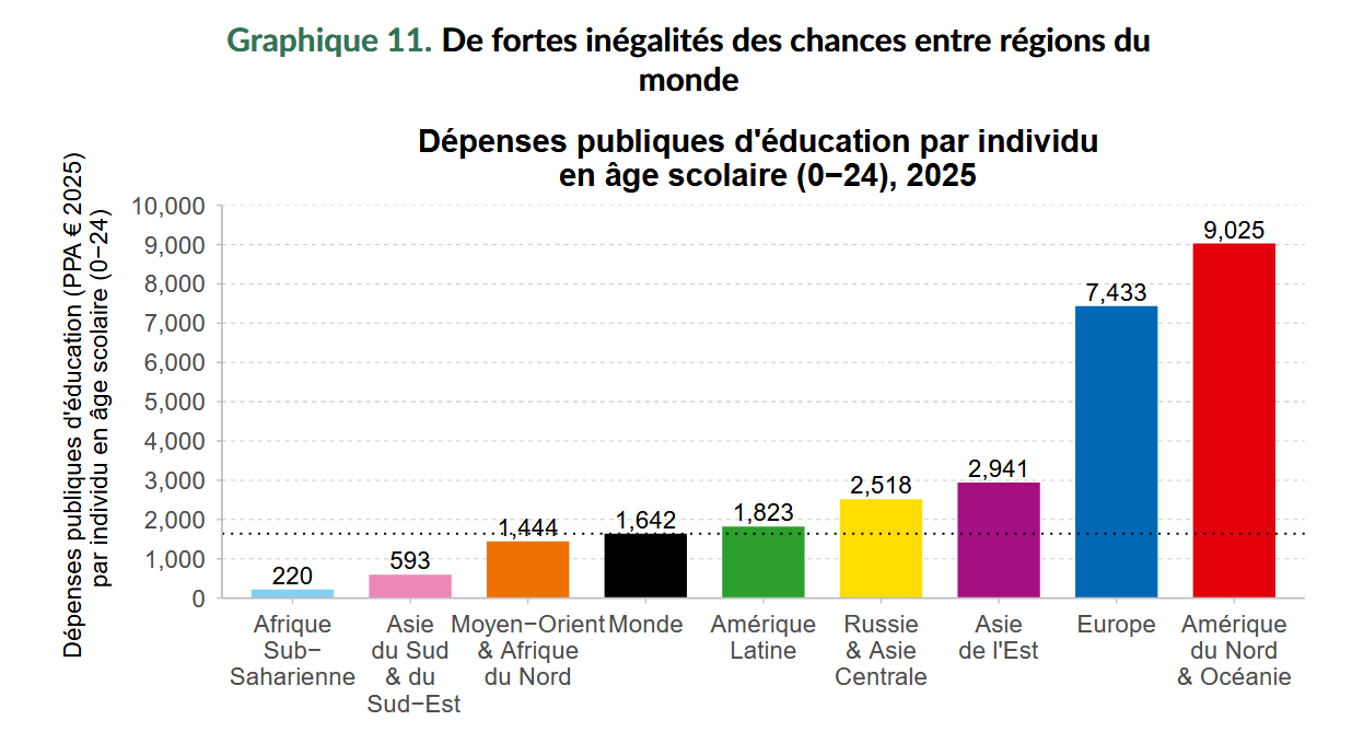 En 2025, les dépenses publiques moyennes consacrées à l’éducation par individu en âge scolaire (0 à 24 ans) varient considérablement d’une région du monde à l’autre, allant de 220 € en Afrique Sub−Saharienne à 9,025 € en Amérique du Nord & en Océanie (PPA 2025), soit un écart de près de 1 à 41. 'cf graphique)