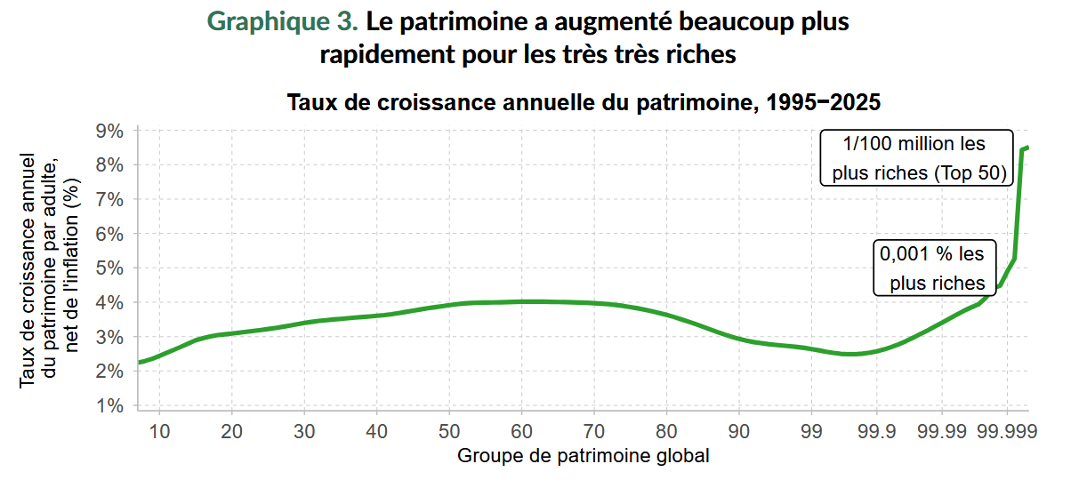 Les taux de croissance du patrimoine personnel net ont fortement varié à travers la distribution mondiale entre 1995 et 2025. Alors que les 50 % les plus pauvres ont connu une croissance positive d’environ 2− 4 % par an, leur faible patrimoine initial leur a permis de ne capter que 1.1 % de la croissance totale du patrimoine mondial. En revanche, les 1 % les plus riches ont connu des taux de croissance nettement plus élevés, allant de 2 à 9% par an, et ont capté 36.7 % de la croissance mondiale du patrimoine au cours de la même période. Le sommet de la distribution, qui comprend les 50 individus les plus riches, a connu les augmentations les plus fortes.(cf graphique)