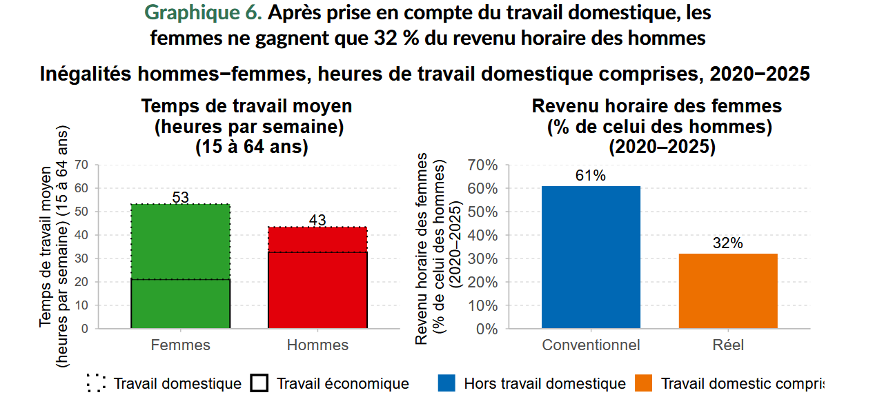 Globalement, les femmes travaillent plus d’heures par semaine que les hommes lorsqu'on tient compte à la fois du travail économique et du travail domestique. Le revenu horaire des femmes est nettement inférieur à celui des hommes : l’écart mesuré est plus faible lorsque seul le travail économique est pris en compte, mais il devient beaucoup plus important lorsque les heures de travail domestique sont incluses. (cf graphique)