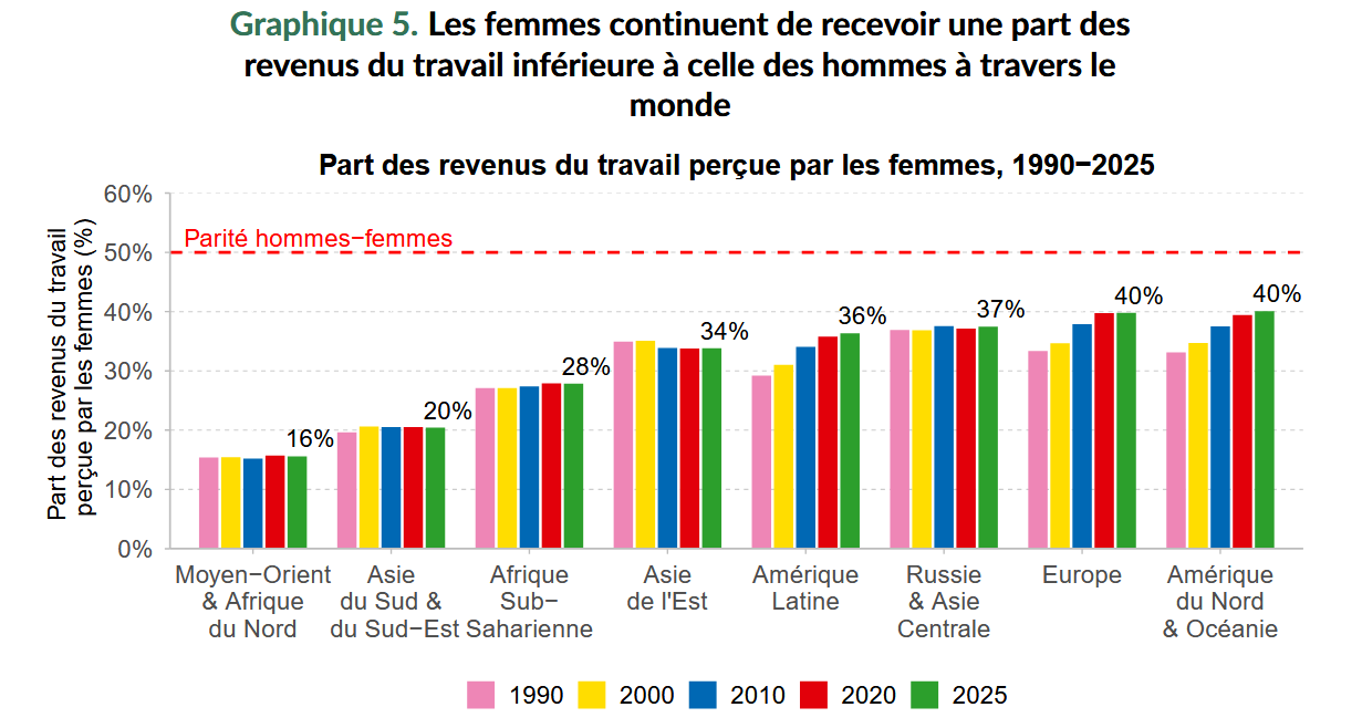 En 2025, les travailleuses gagnent environ 16 % du revenu total du travail au Moyen−Orient & en Afrique du Nord, mais environ 40 % en Amérique du Nord & en Océanie et en Europe. Au niveau mondial, les femmes gagnaient 27.8 % du revenu du travail en 1990 et 28.2 % en 2025 (cf graphique)